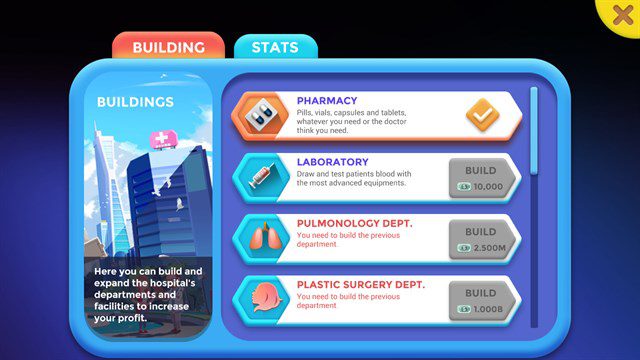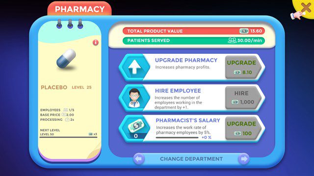 ในเกมเราจะมีแผนกต่างๆ แยกให้เราได้ตัดสินใจในการเลือกบริหารและอัพเกรด เช่น แผนกขายยา (แบบร้านขายยาทั่วไป) แผนกวิจัยยา (แบบที่เภสัชในโรงพยาบาลทำ) แคสเชียร์ ที่จอดรถ รวมไปถึงหมอ ยิ่งคนเล่นอัพเกรด พิ้นที่แผนกนั้นก็จะใหญ่ขึ้น ก็จะจ้างพนักงานหรือขยายพื้นที่เพื่อรองรับลูกค้าที่ที่เป็นผู้ป่วยเข้ามาได้เรื่อยๆ เพื่อสร้างกำไรได้นั่นเอง