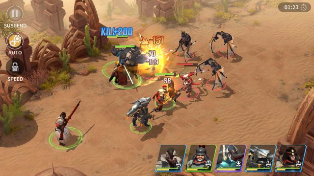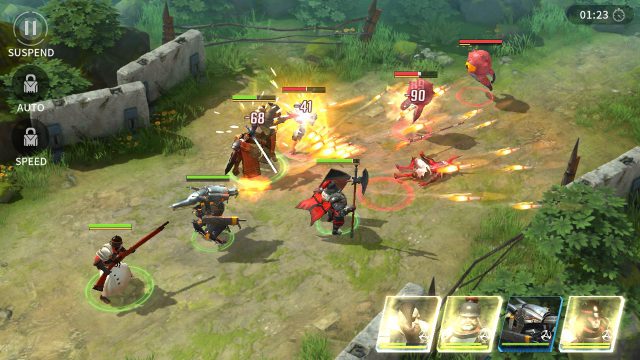 ส่วนอีกส่วนนั่นก็คือส่วนต่อสู้ เมื่อคนเล่นพร้อมสู้กับอีกฝ่ายแล้วก็จะสามารถกดสู้ได้เลย โดยจะเป็นในรูปแบบของเกมตะลุยด่านที่คนเล่นจะสามารถปล่อยให้ตัวละครตีเองและหาจังหวะในการใช้งานสกิลได้ แน่นอนว่าเมื่อผ่านไปซักพักก็จะปลดล็อคโหมดออโต้มาให้เพื่อความสะดวกสบายในการเล่น