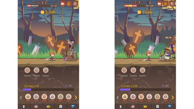 คนเล่นจะสามารถช่วยตัวละครในการโจมตีได้โดยการกดคลิกจิ้มที่หน้าจอเร็วๆ เพื่อที่จะช่วยโจมตี แต่ถ้าไม่กดตี ตัวละครก็จะสามารถโจมตีได้เองแต่จะช้ากว่าขึ้นอยู่กับค่าพลังโจมตี เทียบกับเกมอื่นในแนวเดียวกันแล้วเกมนี้จะไม่ได้เร่งรีบด้วย จึงทำให้เกมนี้ต้องใช้เวลาพักนึงถึงจะย้ายไปโซนต่อไปได้เอง