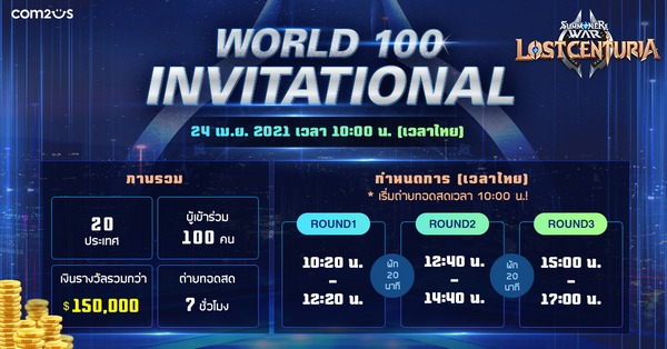 สามารถรับชมไลฟ์สตรีมมิ่งได้ที่เว็บไซต์ออฟฟิชเชียล ‘World 100 Invitational’ และแชนแนล YouTube หลักของ Com2uS และสามารถดูรายละเอียดเพิ่มเติมเกี่ยวกับเกมและการลงทะเบียนล่วงหน้าของ Summoners War: Lost Centuria ได้ที่เว็บไซต์หลัก : https://lostcenturia.summonerswar.com/world100invitational