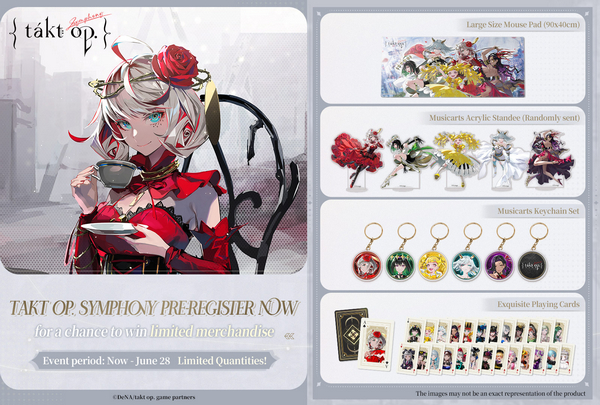 ยอดลงทะเบียนล่วงหน้าเกม “takt op. Symphony” ใน ไต้หวัน ฮ่องกง มาเก๊า เกาหลีใต้ เอเชียตะวันออกเฉียงใต้ และ ภูมิภาคอื่นๆ ได้ทะลุ 1.2 ล้านคนแล้ว ผู้เล่นจะได้รับเหรียญตราลิมิเต็ดและแผ่นเสียงลิมิเต็ดหลังเปิดตัวเกมในวันที่ 28 มิถุนายน นอกจากนี้ ขอเชิญทุกท่านร่วมปลดล็อก “ชุดดนตรี SSR ปริศนา” รางวัลขั้นสุดท้ายในกิจกรรมลงทะเบียนล่วงหน้า!