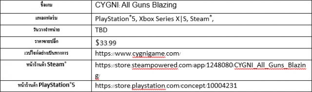 ในวันนี้ ทาง Konami Digital Entertainment Limited และ KeelWorks Ltd สตูดิโอจากสก็อตแลนด์ ได้ประกาศยืนยันแล้วว่า ได้เปิดการสั่งจองเกม CYGNI: All Guns Blazing แบบล่วงหน้า แล้วบนระบบ PlayStation®5 และ Xbox Series X|S. พร้อมกับเผยภาพปกเกมเวอร์ชั่นสุดท้าย โดยมียาน Orca จอดอยู่ด้านหน้า พร้อมเผชิญหน้าและโจมตีทุกอย่างที่ขวางหน้า!