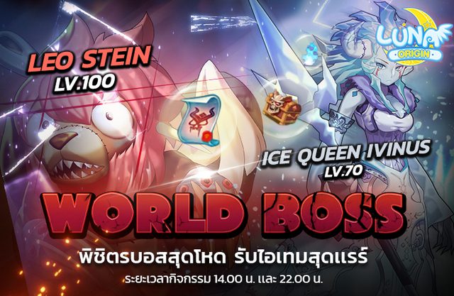 มาเริ่มกันด้วยกิจกรรมแรกกัน เพิ่มความมันส์ให้ผู้เล่น ปลดล็อก World Boss สุดโหด Ice Queen Ivinus LV.70 และ Leo Stein LV.100 ร่วมกันพิชิตรบอสพร้อมรับไอเทมสุดเเรร์ เข้าเล่นได้ทุกวัน 14.00 และ 22.00 น.