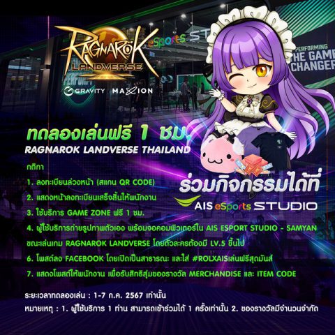 เนรมิตร AIS eSport STUDIO – SAMYAN MITRTOWN สู่ธีม Ragnarok Landverse Thailand ตลอดเดือน ก.ค. 2567 และ พิเศษมาพร้อมกิจกรรมแจก ชั่วโมง Game Zone ฟรี, Merchandise สุดพิเศษ และ Item Code