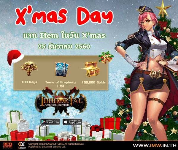 ต้อนรับเทศกาลคริสต์มาสนี้ไปกับ IMW : Immortal Warrior Extreme เกมมือถือแนว Action RPG สัญชาติเกาหลีที่มีภาพและ gameplay เอาใจสายเกมเมอร์ฮาร์ดคอร์ ภาพสวยสะใจเอฟเฟคอลังการณ์ หลังจากที่ขึ้นติดท็อปชาร์ทดาวน์โหลดไปได้ไม่นาน ล่าสุดปล่อยกิจกรรมเอาใจคอเกม แจกไอเท็มกันไปเลยฟรีๆ อาทิเช่น Keys 100, Gold 100,000 และ Tome of Prohency 1 ใบ พลาดไม่ได้จริงๆ หนึ่งปีมีเพียงหนึ่งครั้งไม่ต้องรอซานต้าครอสมาวางของขวัญให้ที่ปล่องไฟแต่อย่างใด เพียงเข้าเล่นเกมในวันที่ 25 ธันวาคม 2560 (เวลา 00.01 – 23.59 น.) นี้เท่านั้นโอกาสดีๆมาถึงแล้วอย่าปล่อยให้หลุดมือไปได้
