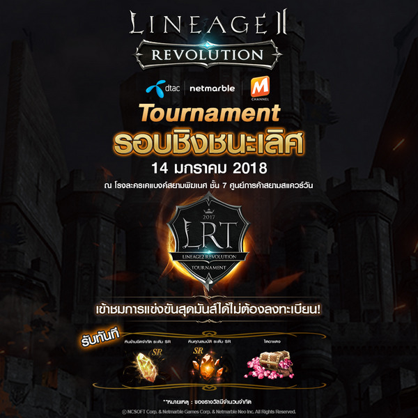 Lineage2 Revolution Tournament รอบชิงชนะเลิศ 14 ม.ค.! เข้าชมได้ไม่ต้องลงทะเบียนล่วงหน้า พร้อมร่วมกิจกรรมรับรางวัลมากมาย