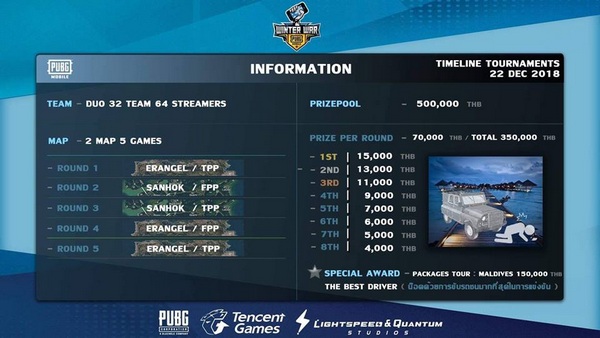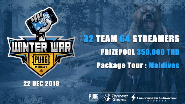 PUBG Mobile จัดกิจกรรมการแข่งขันสุดเร้าใจส่งท้ายปี “PUBG Mobile Winter War” โดยความพิเศษของการแข่งขันนี้อยู่ที่ของรางวัลซึ่งรวมมูลค่าสูงถึง 500,000 บาท โดยแบ่งเป็นเงินสด 350,000 บาท และ แพคเกจทัวร์มัลดีฟส์ 3 วัน 2 คืน แบบจัดเต็ม!