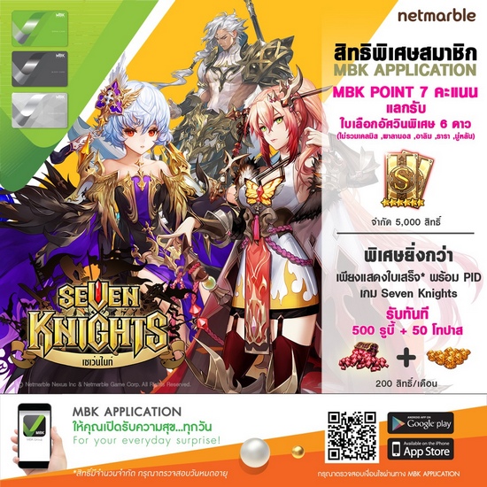 Seven Knights เกมมือถือ RPG สุดฮิตตลอดกาลของเหล่าเกมเมอร์จากค่าย Netmarble จับมือ MBK มอบสิทธิพิเศษสำหรับลูกค้าที่เป็นสมาชิก MBK Application เท่านั้น เพียงใช้ MBK Point 7 คะแนน แลกรับ ไอเทม ใบเลือกอัศวินพิเศษ 6 ดาว ได้แบบง่ายๆ จำกัด 5,000 สิทธิ์ และพิเศษกว่าอีกขั้น เพียงแสดงใบเสร็จ 300 บาท พร้อม PID เกม Seven Knights ที่จุดประชาสัมพันธ์ ชั้น G (โซน B , โซน C) รับทันที 500 รูบี้+50 โทปาส (200 สิทธิ์/เดือน) วันนี้ถึง 31 ส.ค.นี้ หรือจนกว่าสิทธิ์จะหมด