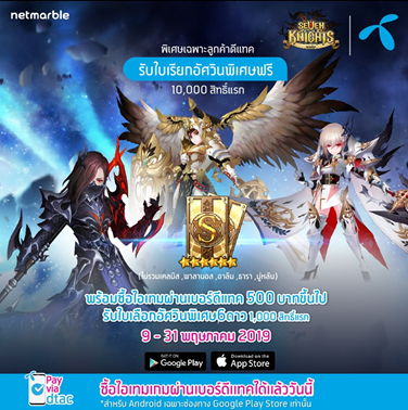 Seven Knights จับมือ DTAC เอาใจเหล่าเกมเมอร์ตัวจริง มอบสิทธิพิเศษให้กับลูกค้าดีแทค รับฟรีไอเทมใบเรียกอัศวินพิเศษ 6 ดาว ฟรี! 10,000 สิทธิ์แรก และพิเศษสุดเมื่อซื้อไอเทมเกมผ่านเบอร์ดีแทค 500 บาทขึ้นไป รับใบเลือกอัศวินพิเศษ 6 ดาวไปเลยทันที! จำกัด 1000 สิทธิ์แรกเท่านั้น! วันนี้ถึง 31 พ.ค. นี้