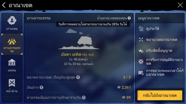 วิธีคือ ไปที่อาณาเขต >เกาะอารยธรรม >การขยายระยะเวลาให้กับอาณาเขต กดฝากเงินเข้าไปจะสามารถขยายได้ตั้งละ 7 วัน ฝากไปให้เต็ม (สูงสุด 30 วัน) เท่านี้พื้นที่เราก็มีอายุอย่างน้อย 30 วันแล้ว เมื่อใกล้ถึงเวลาก็มาฝากเพิ่มเพื่อต่อเวลา อย่าลืมฝากต่ออายุล่ะ!