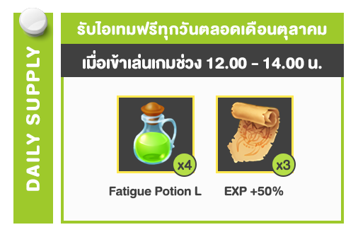 Supply รับไอเทมฟรีทุกวันตลอดทั้งเดือนตุลาคม เมื่อเข้าเล่นเกมช่วง 12.00
