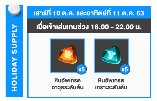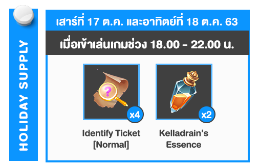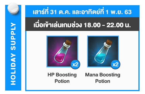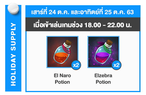 Holiday Supply สนุกกับการตีบวกแบบไม่ต้องกลัวเจ็บหนักพร้อมเดินเควสได้ยาวๆ กับกิจกรรมแจกไอเทมต่างๆ เช่น ใบซ่อมแซมอุปกรณ์ หินอัพเกรด Elzebra Potion เป็นต้น รับเพิ่มอีกทุกเสาร์อาทิตย์ เมื่อเข้าเล่นเกมช่วง 18.00 – 22.00 น.