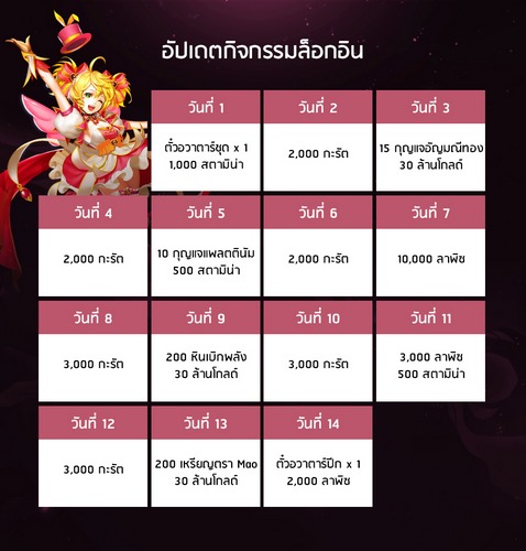 นอกจากนี้ยังมีกิจกรรมต้อนรับอัปเดตเหมือนเดิม ได้แก่กิจกรรมล็อคอินรายวัน 14 วันเช่นเคย แค่เข้าเกมแล้วเล่นทุกวันก็ได้รับรางวัลไปเลยเพียบจ้า!