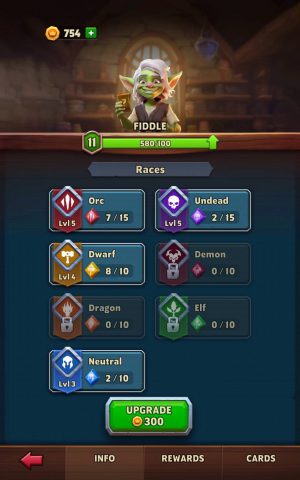 จุดเด่นของ Arcane Rush: Battlegrounds นั่นคือเราสามารถปลดล็อคเผ่าพันธุ์และอัพเกรดการ์ดได้ โดยเก็บ LV Player เพื่อปลดล็อครางวัลและการ์ดฮีโร่เพิ่มเติม และสามารถรางวัลที่ได้ไปสุ่มเพิ่มความสามารถให้กับการ์ดได้สูงสุด 3 LV แลดปลดล็อคการ์ดเผ่าได้รวม 7 เผ่า ได้แก่ Orc ,Dwarf ,Dragon ,Neutral ,Undead ,Demon และ Elf