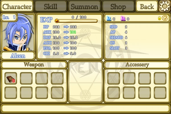 พูดถึง Item จะมีให้เลือกใส่สองประเภทครับคือ อาวุธ กับ เครื่องประดับ ซึ่งในส่วนของอาวุธจะเพิ่มค่า Status หลักของตัวละคร และในส่วนของเครื่องประดับจะเพิ่มพลังโจมตี หรือพลังป้องกันเฉพาะของแต่ละธาตุแทน