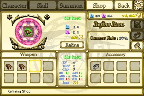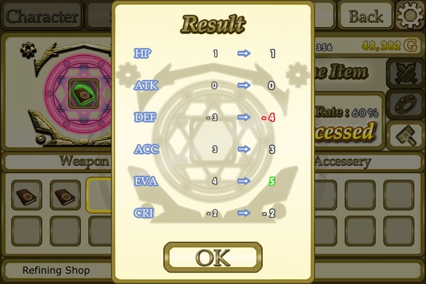 พูดถึงเรื่องการ Refine item บ้าง เกมนี้ไม่มีการตีบวกเหมือนกับเกมทั่วๆ ไปครับ การ Refine คือ การที่เราสามารถเปลี่ยนค่า Status ของ item ได้ แต่ยังคงค่า Pow เท่าเดิม เช่น สามารถเปลี่ยนจาก ATK +6, DEF -3 เป็น ATK +5, DEF -2 หรือ ATK +7, DEF -4 ก็ได้ ตราบเท่าที่ไม่ทำให้ค่าสูงสุด หรือต่ำสุดของแต่ละ Status เกินค่า Cap