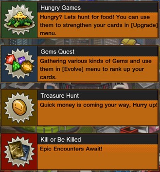 Event Mode : ที่ให้ผู้เล่นหาไอเทมต่างๆ สำหรับพัฒนาการ์ดตัวละครให้แข็งแกร่งยิ่งขึ้น Gold สำหรับใช้สอยในเกม การ์ดตัวละครพิเศษประจำ Event ต่างๆ และรางวัลต่างๆ อีกมากมายให้ผู้เล่นได้ร่วมทดสอบฝีมือ