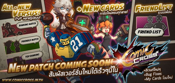 Comic Cross เกมการ์ดบนมือถือสไตล์คอมมิค ฝีมือคนไทย เตรียมอัพเดทแพทช์ใหม่ เพิ่มการ์ดตัวละครใหม่สุดเจ๋ง 3 ตัว, ระบบ Friend List เพิ่มเพื่อนคนโปรดในรายชื่อของคุณ, ระบบ Friendly Match ให้คุณได้ท้าประลองและสนุกกับเพื่อนมากยิ่งขึ้นทุกเวลา และอื่นๆ อีกมากมาย เตรียมตัวให้พร้อมแล้วพบกัน เร็วๆ นี้ !!
