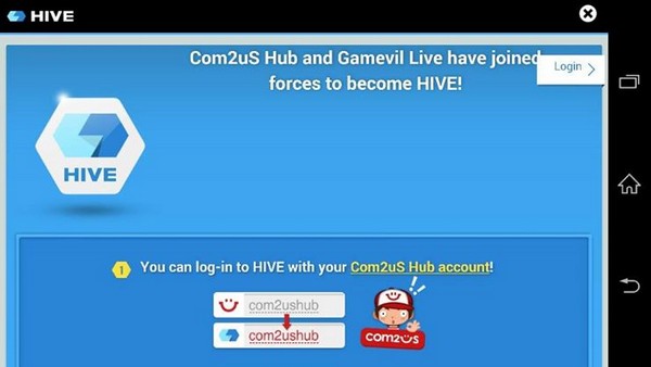อย่างแรกสำหรับผู้เล่นที่เพิ่งเข้ามาใหม่นะคะ ก่อนอื่นต้อง ล็อกอินไอดีเข้าในตัวเกมซะก่อน โดยสามารถล็อกอินไอดีผ่าน Accout ของ Com2uS หรือ HIVE ก็ได้ แต่หากไม่มีเลย ให้กดที่ Login ด้านซ้ายบน ทีนี้จะสามารถล็อกอินผ่าน facebook หรือ gmail ได้แล้ว