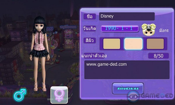 เมื่อเข้าเกมแล้ว เราจะต้องใส่ชื่อ / วันเกิด / สีผิว / แนะนำตัวเอง สามารถเลือกเพศได้ เสร็จแล้วกดปุ่มสร้างตัวละครได้เลย