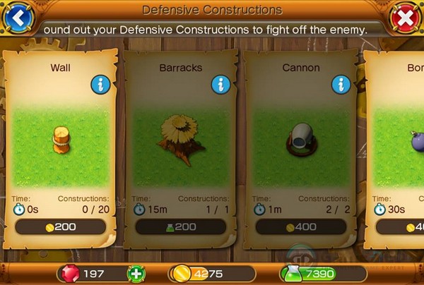 เราสามารถกดเข้าไปที่ไอคอนรถเข็น เพื่อเลือกซื้อป้อมปราการ รวมถึงกับดักต่างๆ ได้ โดยจำนวนของกับดักที่ซื้อได้จะต้องอิงตามเลเวลของเราด้วย