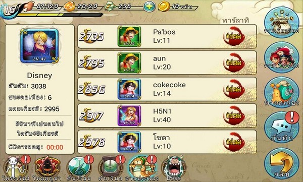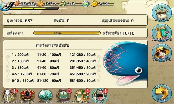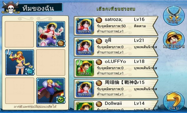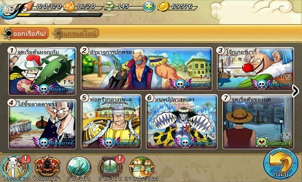 เมื่อได้กัปตันและลูกเรือเป็นที่เรียบร้อยแล้ว ก็ถึงเวลาออกเรือผจญภัยได้แล้ว…(เข้าที่ “เสี่ยง” ด้านซ้ายล่าง) เราจะต้องฝ่าไปทีละด่าน ตามเนื้อเรื่อง และสามารถหาเพื่อนช่วยได้ 1 คน