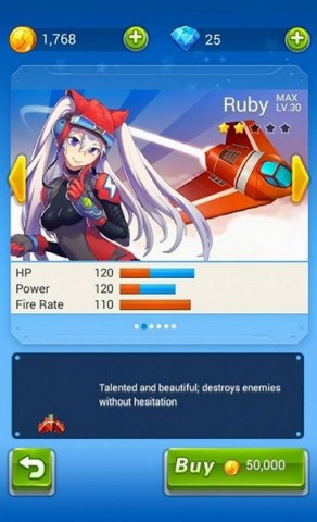 Ruby : แข็งแกร่งขึ้นจาก Wind อีกหนึ่งระดับ เครื่องบินรุ่นนี้มีพลังชีวิตและพลังในการยิงมากกว่า และมีวิถีกระสุนที่แม่นยำ และการยิงไอพ่นที่รวดเร็วกว่า เครื่องบินรุ่นนี้คือรุ่นที่มาพร้อมระบบการยิงที่แม่นยำอย่างแท้จริง