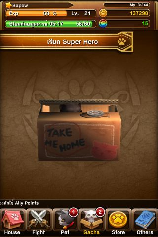 4. Gacha หน้าต่างสำหรับสุ่มแมวตัวใหม่ ซึ่งเกมนี้แจกฟรีชั่วโมงละหนึ่งตัวไม่ต้องมานั่งเก็บแต้มเหมือนเกมอื่นๆด้วย แต่ถ้าเป็นแบบแมวแรร์จะต้องใช้ Meow coin เพื่อเปิดหา