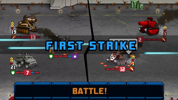 เมื่อเริ่มเกมรถถังแต่ละคันของเราจะทอยลูกเต๋าออกมา ตามพลังโจมตีของรถถังแต่ละคัน หากได้ช่องสีฟ้า จะได้ค่า First Strike ยิ่งค่ารวมของ First Strike ทีมไหนมากสุดจะได้เริ่มโจมตีก่อน