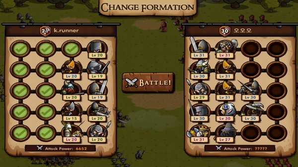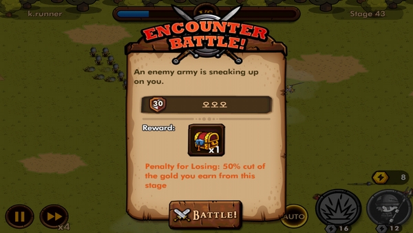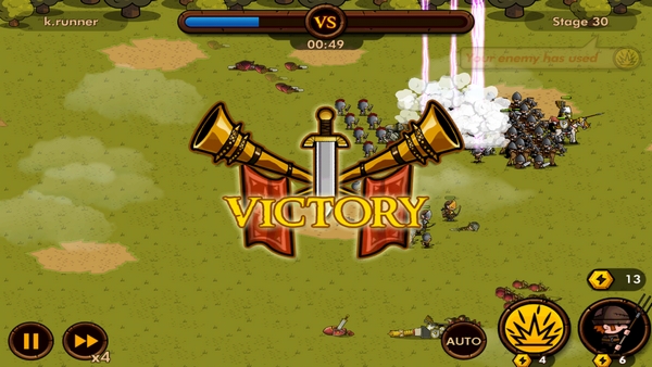 เมื่อจัดกองทัพเสร็จให้กด Battle ได้เลย กองทัพเราจะสู้อัตโนมัติ ตามแผนที่เราได้จัดทัพเอาไว้ หากกองทหารกองไหนมีสกิล กองทัพนั้นก็จะใช้สกิลออกมาอย่างอัตโนมัติ