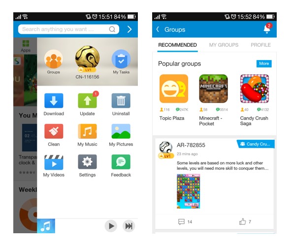 เพราะฟังก์ชั่น “Group” เปรียบเสมือนคอมมูนิตี้เล็กๆ สำหรับคนที่เป็นแฟนคลับตัวยงขอแอปพลิเคชั่น หรือเกมต่างๆ ที่เปิดโอกาสให้ทุกคนได้ร่วมพูดคุย แบ่งปันความประทับใจในตัวแอปนั้นๆ หรือจะแชร์ทริปการเล่นเกมแบบเจ๋งๆ ก็ได้ สำหรับฟังก์ชั่นนี้ ทุกคนสามารถเข้าได้จาก Topic Plaza ที่คุณสามารถสร้างโปรไฟล์ส่วนตัว และสามารถอัพเดทสเตตัสต่างๆ เพื่อแบ่งปันความประทับใจ ความสุข ความสนุกหรือจะโสด เศร้า เหงาก็แชร์กับเพื่อนๆ ได้ทุกเวลา เนื่องจาก “Group” ได้เปิดโอกาสให้คนที่ใช้งาน Mobogenie จากทั่วโลกกว่า 440 ล้านคน ได้มาร่วมแชร์ความคิดเห็นกัน ไม่ว่าจะชอบเพลง วิดีโอ หรือเกมมันส์ๆ ประเทศไหนถ้าคอเดียวกันก็เป็นเพื่อนกันได้ นอกจากนี้ทุกๆครั้งที่มีการอัพเดทสเตตัส คอมเม้น รีวิว หรือดาวน์โหลดแอปพลิเคชั่นผ่าน Mobogenie ก็จะมีการสะสมคะแนน ที่สามารถเอาไปแลกของรางวัลต่างๆได้ในอนาคต
