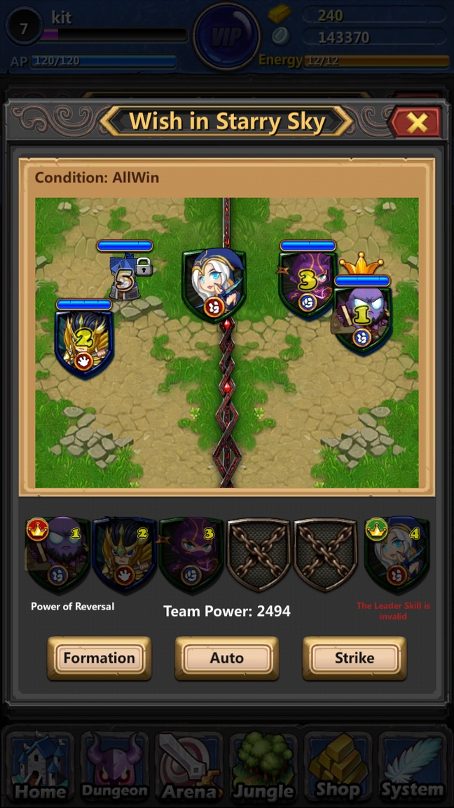 ส่วนสกิลนั้น ตัวละครจะใช้อย่างอัตโนมัติ ซึ่งสกิลจะมี 2 อย่างก็คือ สกิลธรรมดาที่โจมตีออกมาค่อนข้างถี่ และสกิลแบบ Leader Skill ซึ่งเวลาใช้จะคัตซีนขึ้นมา และสามารถใช้ได้รอบละไม่กี่ครั้งเท่านั้น