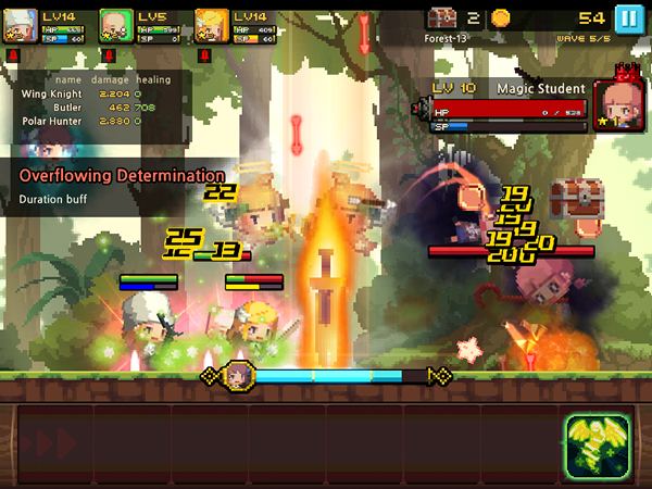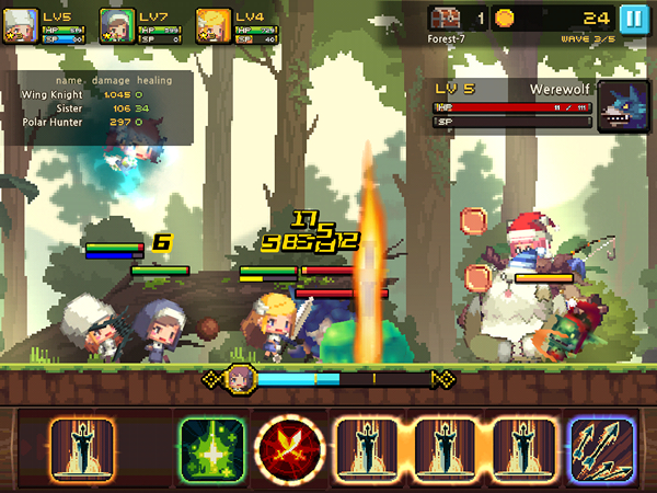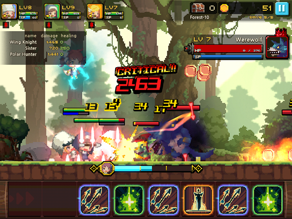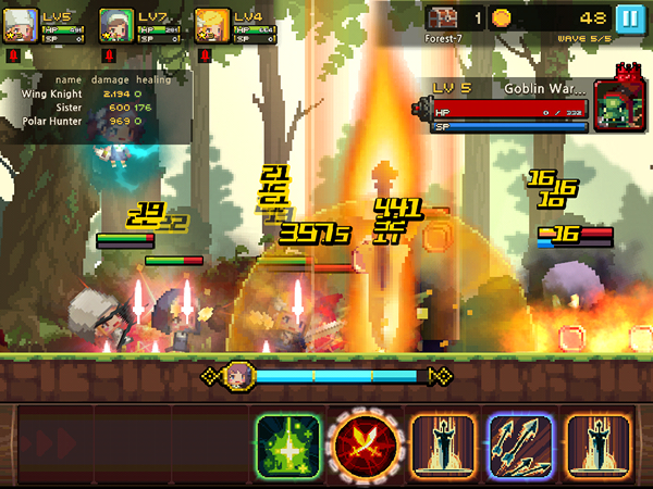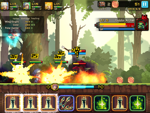 เมื่อเราทำการลุยดันเจี้ยนเหล่าฮีโร่ของเราจะเดินและโจมตีแบบอัตโนมัติ แต่เราจะสามารถควบคุมการใช้สกิลของเหล่าฮีโร่ที่เรามีได้ ด้วยการกดที่พาแนลสกิลด้านล่างที่จะไหลมาแบบสุ่ม หากเราเรียงสัญลักษณ์สกิลที่เหมือนกันจำทำให้ Hero ตัวนั้นสามารถใช้สกิลได้รุนแรงขึ้น