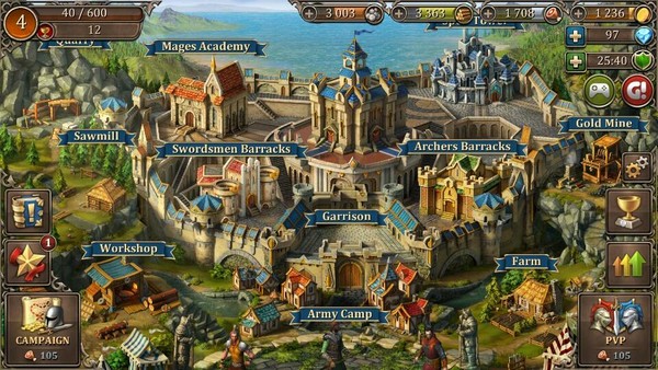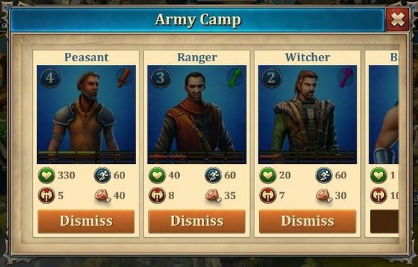 Army Camp ค่ายทหาร ไว้สร้างและอัพเกรดทหารต่างๆ สังเกตได้ว่า ทหารจะมี 3 ประเภทตามสัญลักษณ์อาวุธ คือ นักดาบ นักเวทย์ และพลธนู