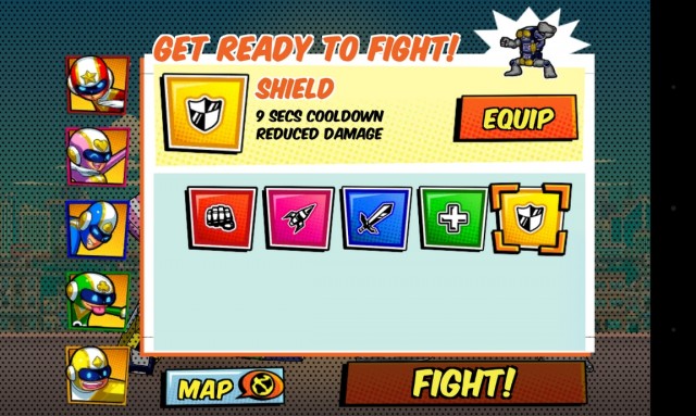 ก่อนเริ่มการต่อสู้ ให้เราเลือกใส่อาวุธประจำตัวฮีโร่ก่อน สามารถเลือกได้อย่างละ 1 สี รวมทั้งหมด 5 ท่า ได้แก่ หมัด ,จรวด ,ดาบ ,ฟื้นฟู ,บาเรีย เมื่อเลือกเสร็จแล้วก็เข้าสู่การต่อสู้