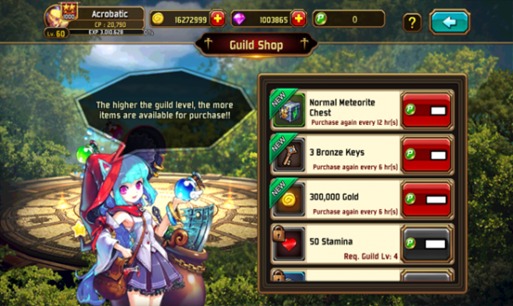 สำหรับอัพเดทใหม่จะมาภายในสัปดาห์นี้ ซึ่งจะมีร้านค้ากิลด์กับปราการกิลด์มาให้เราได้สนุกกันด้วย การจะเข้าร้านค้ากิลด์ได้ ก่อนอื่นคุณต้องเข้าร่วมกิลด์ก่อน เมื่อมีกิลด์แล้วคุณจะสามารถซื้อไอเทมสุดเจ๋งต่างๆ ได้โดยใช้แต้มร้านค้ากิลด์ที่สามารถหามาได้จากการสู้ในศึกปราการกิลด์ รวมถึงกิจกรรมต่างๆ ในกิลด์ นี่จึงเป็นอีกทางเลือกหนึ่งที่จะทำให้คุณมีไอเทมดีๆ ได้นอกจากการเก็บสะสมทองหรือกะรัตไปเรื่อยๆ