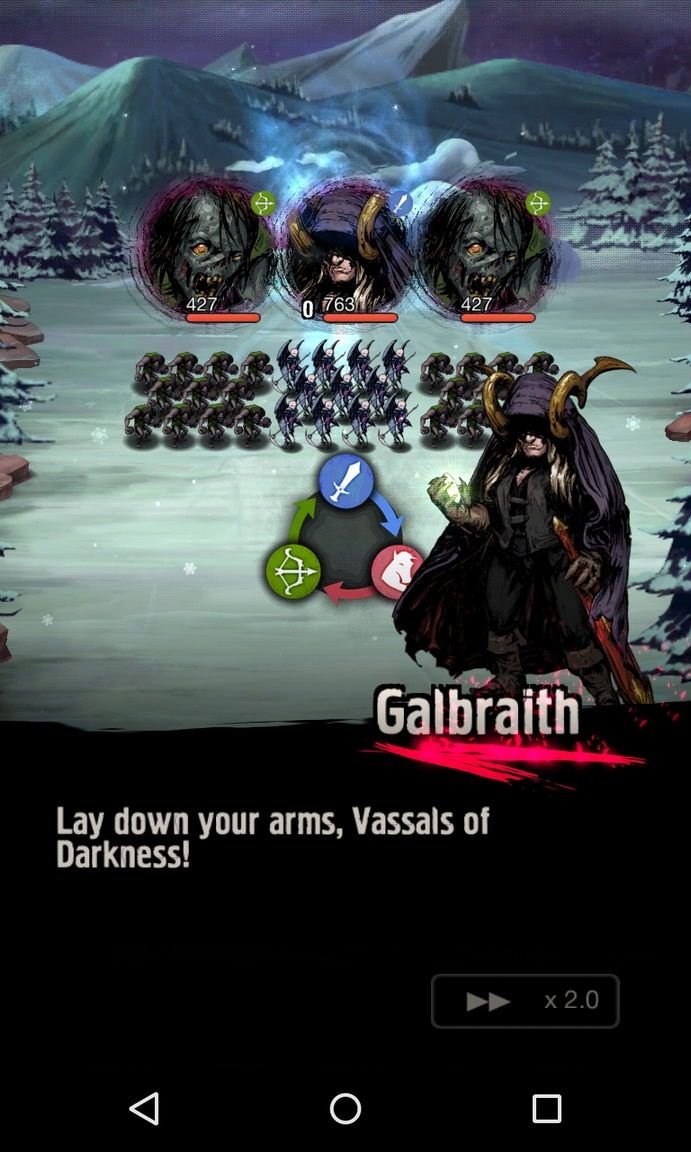 ในการต่อสู้ เราจะต้องเลือกทีละ 3 ยูนิต ในการออกรบของแต่ละรอบ ซึ่งควรจะเลือกลงยูนิตที่ชนะทางศัตรูเอาไว้ ดังนี้ ดาบชนะม้า ม้าชนะธนู และธนูชนะดาบ หากปะทะกับตัวที่แพ้ทาง เราจะโจมตีได้แรงขึ้นและถูกโจมตีเบาลง