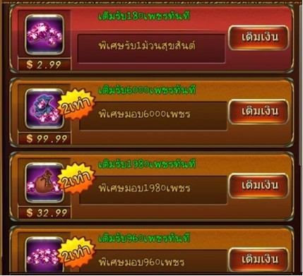 เงื่อนไขกิจกรรม : การเติมเงิน 3ครั้งแรก ในแต่ละช่องทาง และ ในแต่ละราคา(ยกเว้น2.99$หรือ100บาท ที่จะได้รับม้วนสุขสันต์) จะได้รับสิทธิ์เพชรคูณ 2, 1.5, 1.2 รวมสามครั้งตามลำดับ เมื่อใช้สิทธิ์คูณของราคานั้นครบ 3ครั้งแล้ว เมื่อผู้เล่นเติมราคาเดิมเป็นครั้งที่4 จะไม่ได้รับผลคูณอีกแล้ว แต่สามารถเปลี่ยนราคาหรือช่องทางการเติมอื่นๆ เพื่อรับสิทธิ์คูณ3ครั้งได้อีกจนครบทุกราคา! และทุกช่องทาง! (ยกเว้น2.99$หรือ100บาท ที่จะได้รับม้วนสุขสันต์ จะไม่ได้รับผลคูณกิจกรรมนี้)