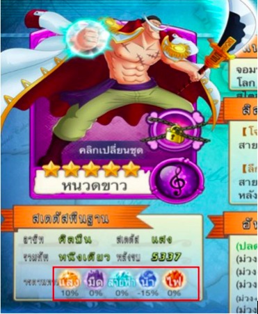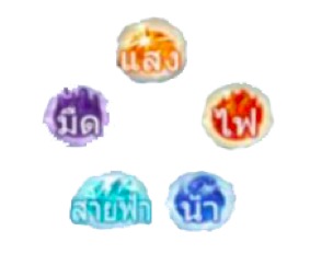 TIP : เราจะเห็นได้ว่าธาตุทั้ง 5 จะวนลดป้องกันธาตุจนกลับมาธาตุเดิม ซึ่งเราสามารถจัดทีมทั้ง 5 ตัวละครให้ครบทั้ง 5 ธาตุได้ และเรียงลำดับการโจมตีด้วยสปีด(ความเร็ว) ของตัวละครนั้น