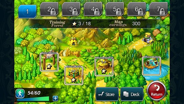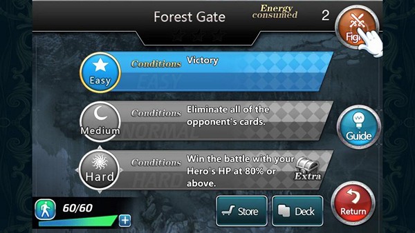 ก่อนเริ่มต่อสู้เราจะเดินทางเข้าสู่แผนที่ อันไหนเราสู่ผ่านไปได้แล้วก็จะมีสัญลักษณ์ขึ้นมาซึ่งในแต่ละด่านเมื่อคลิ๊กเข้าไป ก็จะแบ่งเป็นระดับความยากที่ระบุเงื่อนไขการชนะออกเป็นอีก 3 ระดับ ให้เราเลือกเก็บไปเรื่อยๆ