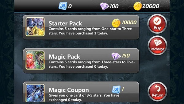 และจุดสำคัญแน่นอนว่าเป็นเกมการ์ด ก็ต้องอยู่ที่การ์ด การตามล่าหาการ์ดระดับเทพๆ มาไว้ในครอบครอง ก็คือการสุ่มนั่นเอง การ์ดมีตั้งแต่ 1 ดาว – 5 ดาว การสุ่มแบ่งออกเป็น 3 ระดับ ที่จะทองซื้อนั้น จะได้การ์ดไม่เกิน 3 ดาว ถ้าอยากได้การ์ด 4- 5 ดาว คงต้องใช้เพชร หรือ Magic coupon เท่านั้น