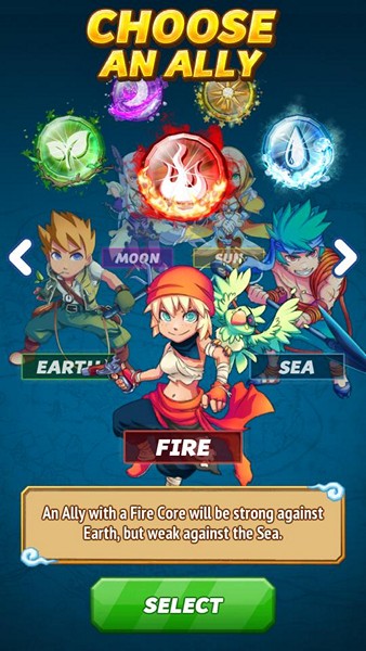เริ่มเกมมาเราก็ต้องทำการเลือกตัวละคร ตัวแรกก่อน ซึ่งจะเป็นการเลือกแบบกำหนดธาตุได้ มี 5 ธาตุด้วยกัน คือ ดิน/น้ำ/ไฟ/พระจันทร์/พระอาทิตย์ ซึ่งมีความสามารถแตกต่างกัน