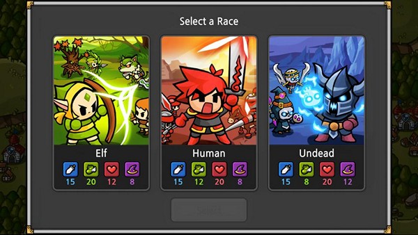 เริ่มเกมมา เราจะต้องทำการเลือกเผ่าที่จะให้ฮีโร่ของเราสังกัด ซึ่งแต่ละเผ่าจะมีค่าสเตตัสความสามารถต่างๆ โชว์อยู่ด้วย มีด้วยกันทั้งหมด 3 เผ่า คือ Elf/Human และ Undead ก็แล้วแต่ความถนัดและความชอบของเพื่อนๆ ว่าจะเลือกสังกัดเผ่าไหน