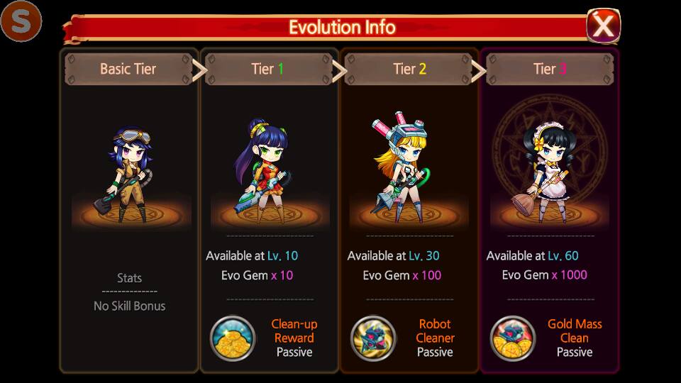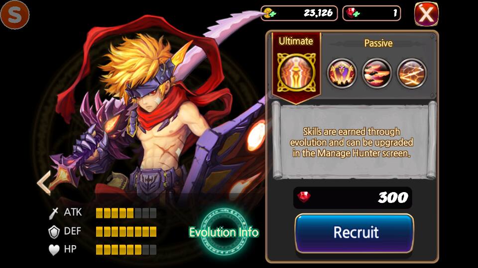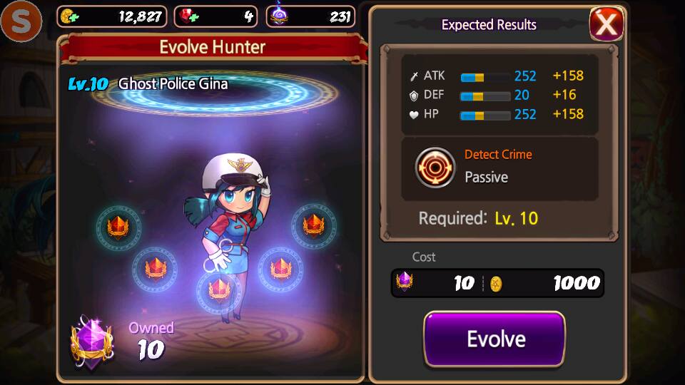 ส่วนการ Evolve หรือการพัฒนาร่างจะต้องมีเงื่อนไขที่เลเวล และเก็บ Evo Gems ให้ครบตามที่กำหนด จากนั้นเข้าที่เมนู Evolve Hunter ได้เลย