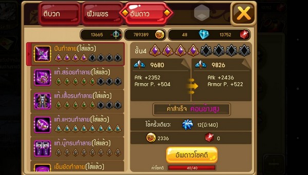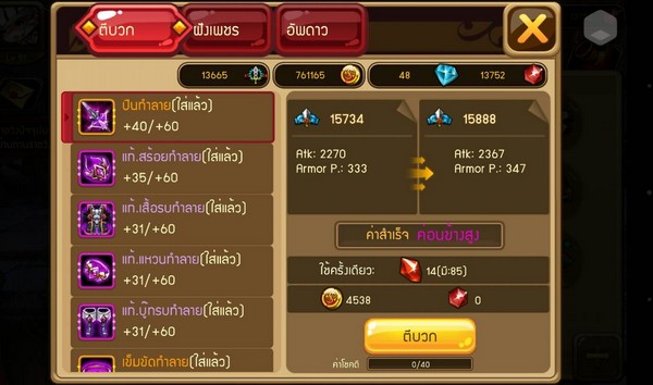 อีกเช่นเคย เมื่อทำการคลิกไปที่อัพดาว ขั้นตอนจะเหมือนกันกับการตีบวกอุปกรณ์เลยค่ะ แต่จะแตกต่างกันเล็กน้อยตรงที่การอัพดาวนั้นจะมี เป็นขั้นๆ ซึ่งมีหลายขั้นมาก