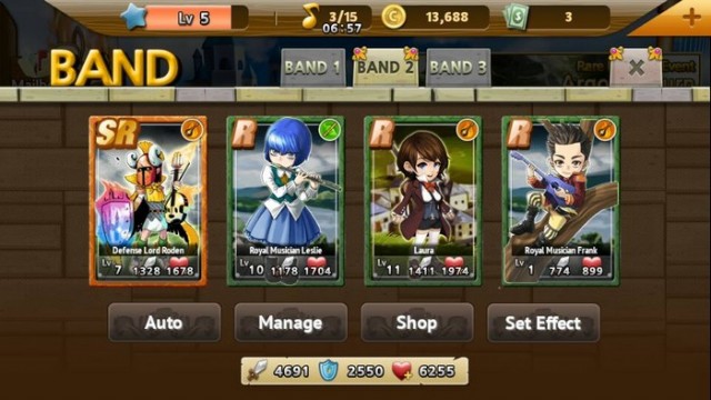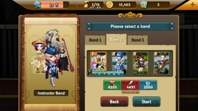 ตัวเกมนั้นเราจะต้องหาการ์ดนักดนตรีมาต่อสู้กับมอนสเตอร์ตามด่านต่างๆ ใน ซึ่งการ์ดจะแบ่งเกรดตามค่าสเตตัส C , R , SR , E และ L โดย C คือการ์ดธรรมดา และ L คือการ์ดแรร์พิเศษ โดย 1 วงจะต้องใช้ 4 การ์ดนักดนตรี และแต่ละการ์ดนั้นจะแบ่งประเภทเครื่องดนตรีอีกด้วย ได้แก่ อาทิเช่น Tambourine, Antler Horn, Mandolin, Whistle เป็นต้น แต่ส่วนใหญ่ก็จะเป็นเครื่องตี เครื่องสี เครื่องเป่า ตามวงออเครสตร้านั่นแหล่ะ