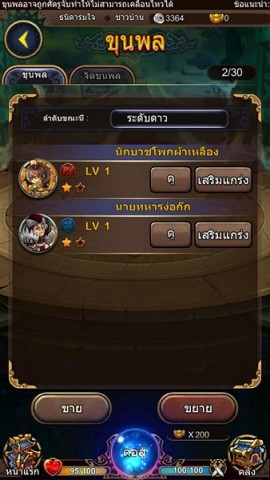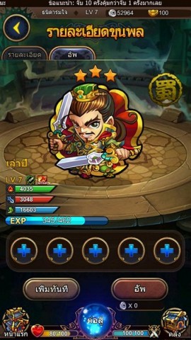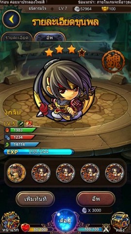 และเรายังสามารถทำการอัพเกรดความสามารถตัวละครได้ที่โหมดเสริมแกร่งขุนพล เป็นการอัพเลเวลตัวละคร ที่เราหามาได้จากการผจญภัย การเลื่อนขั้นของขุนพลนั้นสามารถทำได้ง่ายๆ โดยเมื่อมีการอัพเกรดขุนพลถึงระดับหนึ่งแล้ว ระบบจะเปิดให้ผู้เล่นอัพเกรดไปสู่ขั้นที่สูงกว่า โดยผู้เล่นสามารถเลื่อนขั้นขุนพลได้ตั้งแต่ ระดับ 1 ดาว ไปจนถึง 5 ดาว และขุนพลพิเศษบางตัวจะสามารถเลื่อนขั้นจาก 5 ดาวไป 6 ดาว ได้ ซึ่งจะส่งผลให้รูปลักษณ์ ความแข็งแกร่งนั้นสูงขึ้นกว่าเดิมมาก ยิ่งขึ้นไปอีกแน่นอน