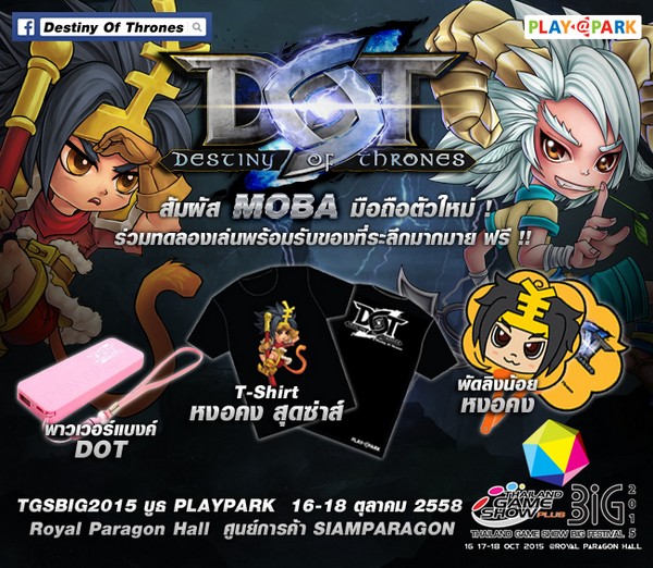 Destiny Of Thrones หรือ “DOT” เกม MOBA มือถือตัวใหม่ล่าสุด บุกงาน TGSBIG2015 พร้อมให้เพื่อนๆ ได้ร่วมเล่นในงาน TGSBIG 2015 16 – 18 ตุลาคมนี้ ณ รอยัลพารากอนฮอลล์ ศูนย์การค้าสยามพารากอน ภายในงานเพื่อน ๆ จะได้ร่วมทดลองเล่นพร้อมแข่งขันมินิแมตช์สุดมันส์ ด้วยฮีโร่สุดเท่มากมายกว่า 50 ตัว ทั้งสนุกแถมยังได้รับของที่ระลึกติดไม้ติดมือกลับบ้านเช่น พาวเวอร์แบงค์ DOT , เสื้อ T-Shirt หงอคงสุดซ่าส์ และพัดลิงน้อย หงอคง
