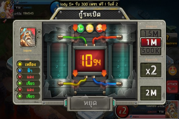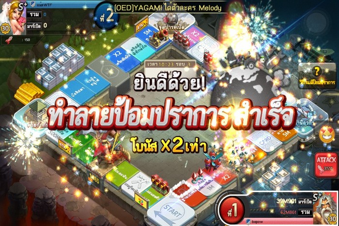 เมื่อเริ่มเกม หลังจากเลือกแล้วว่าใครได้เดินก่อน ระบบจะสุ่ม 1 พื้นที่ในกระดาน 4 ฝั่งให้คนละ 1 อันเพื่อเป็นป้อมฐานไว้โจมตีหรือเป็นตัวชี้วัดว่าใครจะชนะ เพราะถ้าฐานถูกโจมตีจนพังก็จะแพ้ทันที โดยเราจะสามารถโจมตีฝั่งตรงข้ามได้เมื่อตกลงทื่ฐานของเรา หรือถ้าตกที่ฐานที่ว่างอยู่ของ 2 ฝั่งที่เหลือจะเป็นป้อมช่วยยิงสนับสนุนได้อีกทางหนึ่งและเกมโบนัสของฉากนี้ก็ได้เปลี่ยนรูปแบบการเล่นเป็นเลือกตัดสายไฟกู้ระเบิด ซึ่งต้องตัดสามครั้งเลือกสีเดิมไม่ได้และต้องเลือกก่อนเวลาจะหมดถือว่าลุ้นได้สนุกอีกแบบหนึ่ง เพราะขั้นแรกน่าจะถูกแน่นอนเพราะโอกาสพลาดเพียงแค่ 1/4เท่านั้นเอง แต่ต้องมีค่าพลังเกมวัดดวงเยอะๆ หน่อยนะครับกันพลาด
