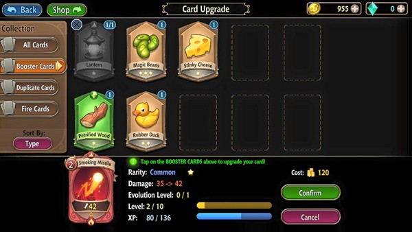 ตัวการ์ดนั้นมีให้เลือกมากถึง 130 แบบ ในหลายๆ ประเภทการ์ด ที่สามารถทำการอัพเกรดและเพิ่มพลังความสามารถของการ์ดแต่ละใบได้ ด้วยการรวมเอาวัตถุดิบที่สะสมจากการเล่นเควสมาใช้ในการอัพเกรด หรือจะเปิดสุ่มการ์ดใหม่ตามระดับที่มีให้เลือกความแรร์ได้ 3 ระดับ หรือจะรวบการ์ดแบบเดียวกัน ให้เป็นการ์ดที่แข็งแกร่งขึ้นก็ได้